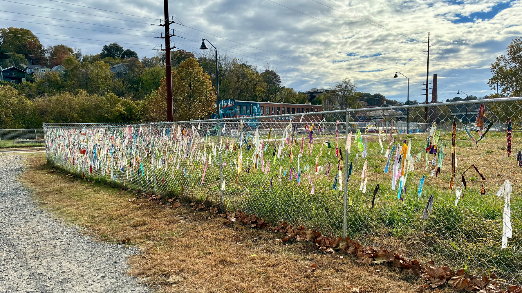 Along the French Broad River in Ashville, a chain leak fence repurposed as community art and therapy. Tie a ribbon and let it go.