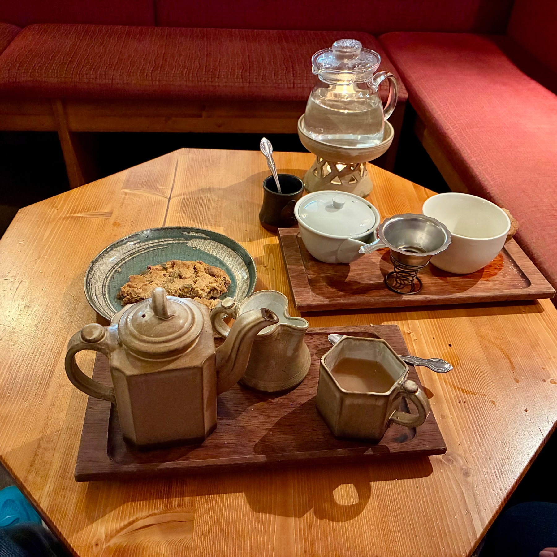 At Dobra Tea in Asheville, green tea for my wife, I partook of Masala spiced(!) chai, cut with milk and dark, dark chocolate sugar. Three cups later my chest is vibrating like a tuning fork–love it!