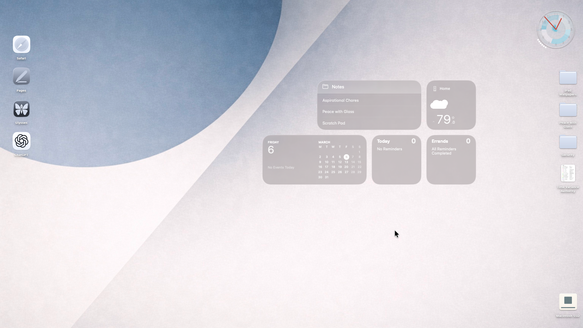 My Mac desktop works best as a calm workbench rather than a dashboard. The left edge holds stable anchors and frequently used tools that rely on spatial memory, while the top-right column is reserved for incoming files so Finder’s natural placement behavior supports file triage. The center remains mostly empty to preserve clarity and allow temporary grouping of work items. Only persistent instruments that genuinely influence behavior are allowed on the surface; unused informational elements are removed. When the desktop fades into the background and simply supports seeing, sorting, and moving files, the design is doing its job.